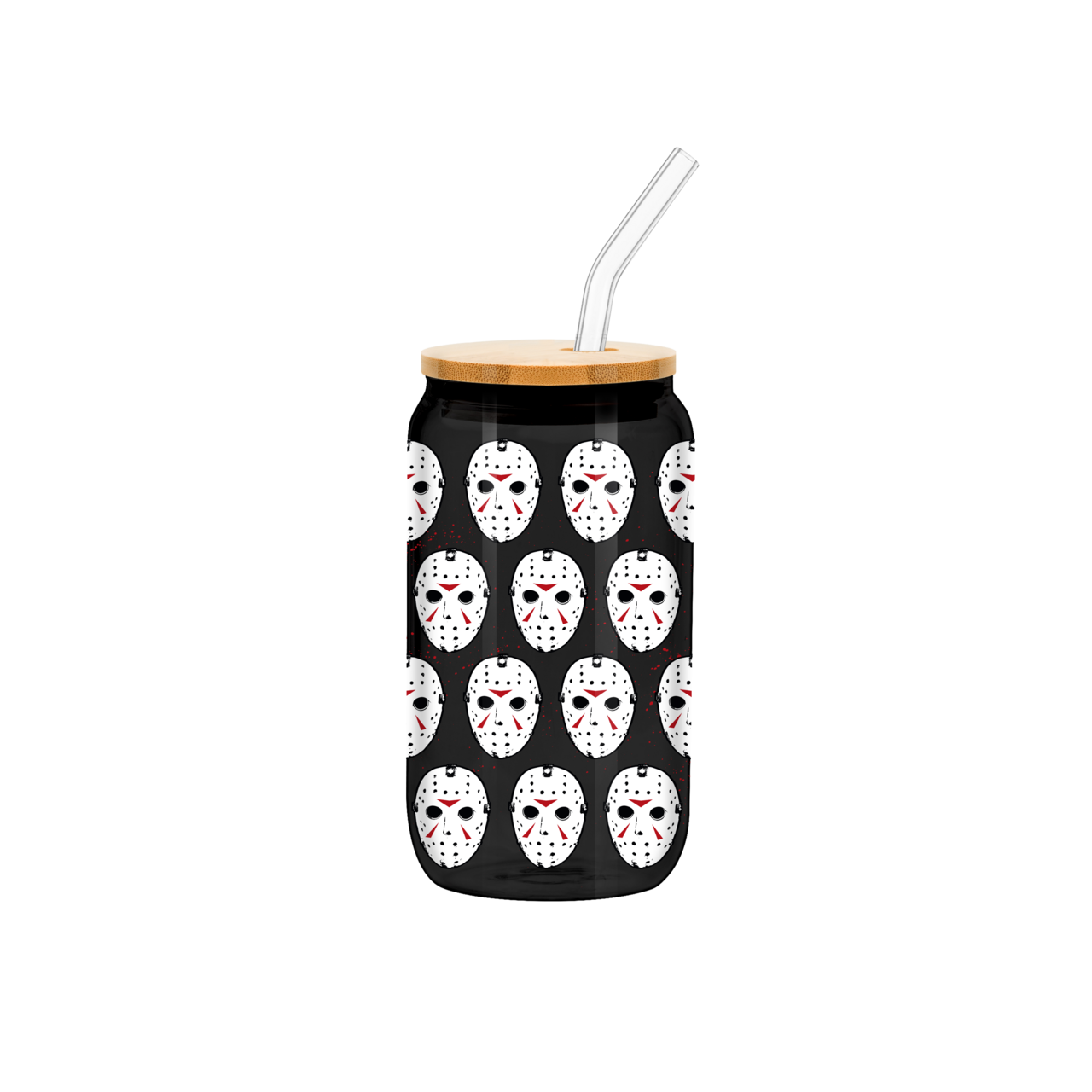 Stay refreshed in killer style with this Friday the 13th 16oz black glass tumbler, featuring a haunting Jason mask pattern that’s perfect for horror fans. Made with high-quality, BPA-free glass, this tumbler includes a natural bamboo lid to keep drinks secure, and a reusable glass straw for eco-friendly sipping. The eerie Jason mask design stands out against the dark background, adding a spooky touch to every drink. Perfect for iced coffee, smoothies, or any cold beverage, this tumbler combines frightful style with everyday functionality—ideal for fans of the classic horror franchise. Hand wash recommended to preserve the design.